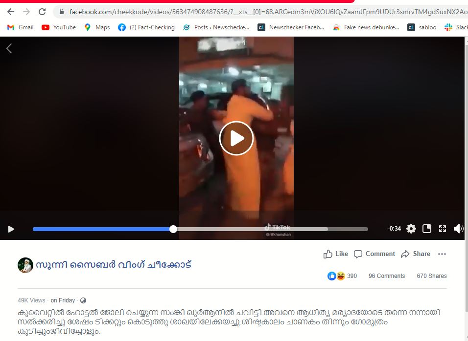 ”മോദിയുടെ ഒരു കട്ട അനുഭാവി കുവൈറ്റിൽ വിശുദ്ധ ഖുർആനിൽ ചവിട്ടി. സ്വയം ഫോട്ടോയെടുത്തു. ഒരു റെസ്റ്റോറന്റിൽ ജോലി ചെയ്തുകൊണ്ടിരുന്ന ചാണക സംഘി അയാളോടൊപ്പം ജോലി ചെയ്യുന്ന മുസ്ലീങ്ങളെ അവൻ അപമാനിച്ചു. പിന്നെ അവൻ്റെ കാര്യത്തിൽ കുവൈത്തികളുടെ തീരുമാനം ഇതാണ്,” എന്ന പേരിൽ ഒരു പോസ്റ്റ്.