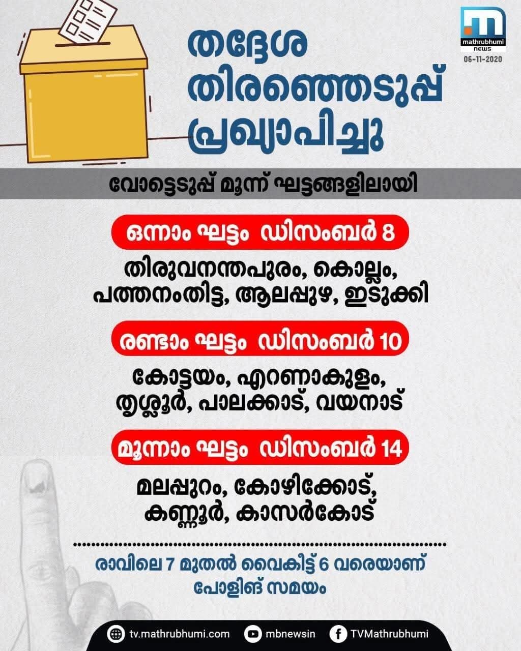 “തദ്ദേശ തിരഞ്ഞെടുപ്പ് പ്രഖ്യാപിച്ചു, വോട്ടെടുപ്പ് മൂന്ന് ഘട്ടങ്ങളിലായി” എന്ന പേരിൽ മാതൃഭൂമി ന്യൂസിന്റെ ഒരു വാർത്ത കാർഡ്.