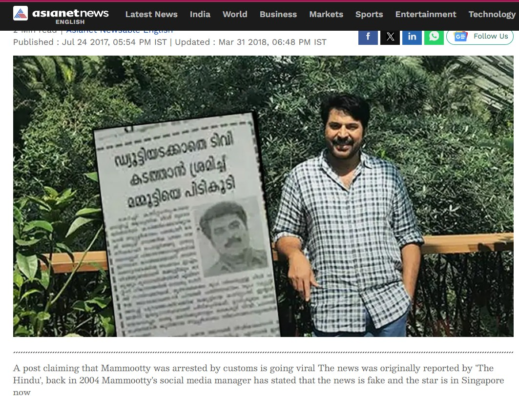 2017-ൽ, തെറ്റായ അവകാശവാദം പ്രചരിക്കുന്ന സമയത്ത് മമ്മൂട്ടി സിംഗപ്പൂരിലായിരുന്നുവെന്ന് അദ്ദേഹത്തിന്റെ സോഷ്യൽ മീഡിയ മാനേജർ ഫേസ്ബുക്കിൽ വ്യക്തമാക്കി.