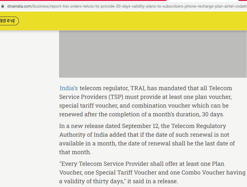 സെപ്തംബർ 13, 2022ലെ വാർത്തയിൽ ഡിഎൻഎ ഇങ്ങനെ പറയുന്നു: ”എല്ലാ ടെലികോം സേവന ദാതാക്കളും കുറഞ്ഞത് 30 ദിവസം വാലിഡിറ്റി ഉള്ള ഒരു പ്ലാൻ വൗച്ചർ, പ്രത്യേക താരിഫ് വൗച്ചർ, കോമ്പിനേഷൻ വൗച്ചർ എന്നിവ ഉപഭോകതാക്കൾക്ക് നൽകണമെന്ന നിബന്ധന ട്രായ് കൊണ്ട് വന്നു.”