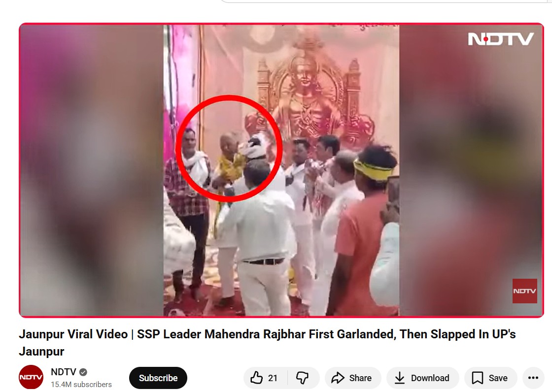 വീഡിയോ ഉത്തർപ്രദേശിലെ സുഹെൽദേവ് സ്വാഭിമാൻ പാർട്ടി അധ്യക്ഷൻ മഹേന്ദ്ര രാജ്ഭറിനെ മർദ്ദിക്കുന്നതിന്റെ ദൃശ്യങ്ങളാണ്.