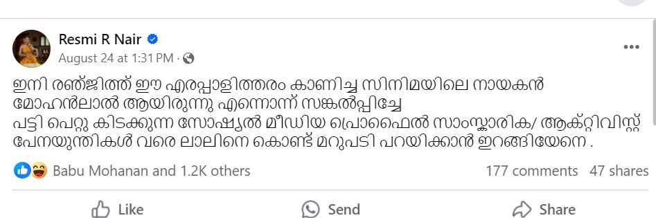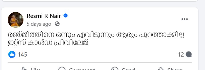 പോരെങ്കിൽ, ഓഗസ്റ്റ് 24,2024ൽ രണ്ടു പോസ്റ്റുകളിൽ രഞ്ജിത്തിനെ രണ്ടു പോസ്റ്റുകളിൽ രശ്മി നായർ വിമര്ശിച്ചതായും കണ്ടെത്തി. “രഞ്ജിത്തിനെ ഒന്നും എവിടുന്നും ആരും പുറത്താക്കില്ല ഇറ്റ്സ് കാൾഡ് പ്രിവിലേജ്,” എന്നാണ് ഒരു പോസ്റ്റ്.