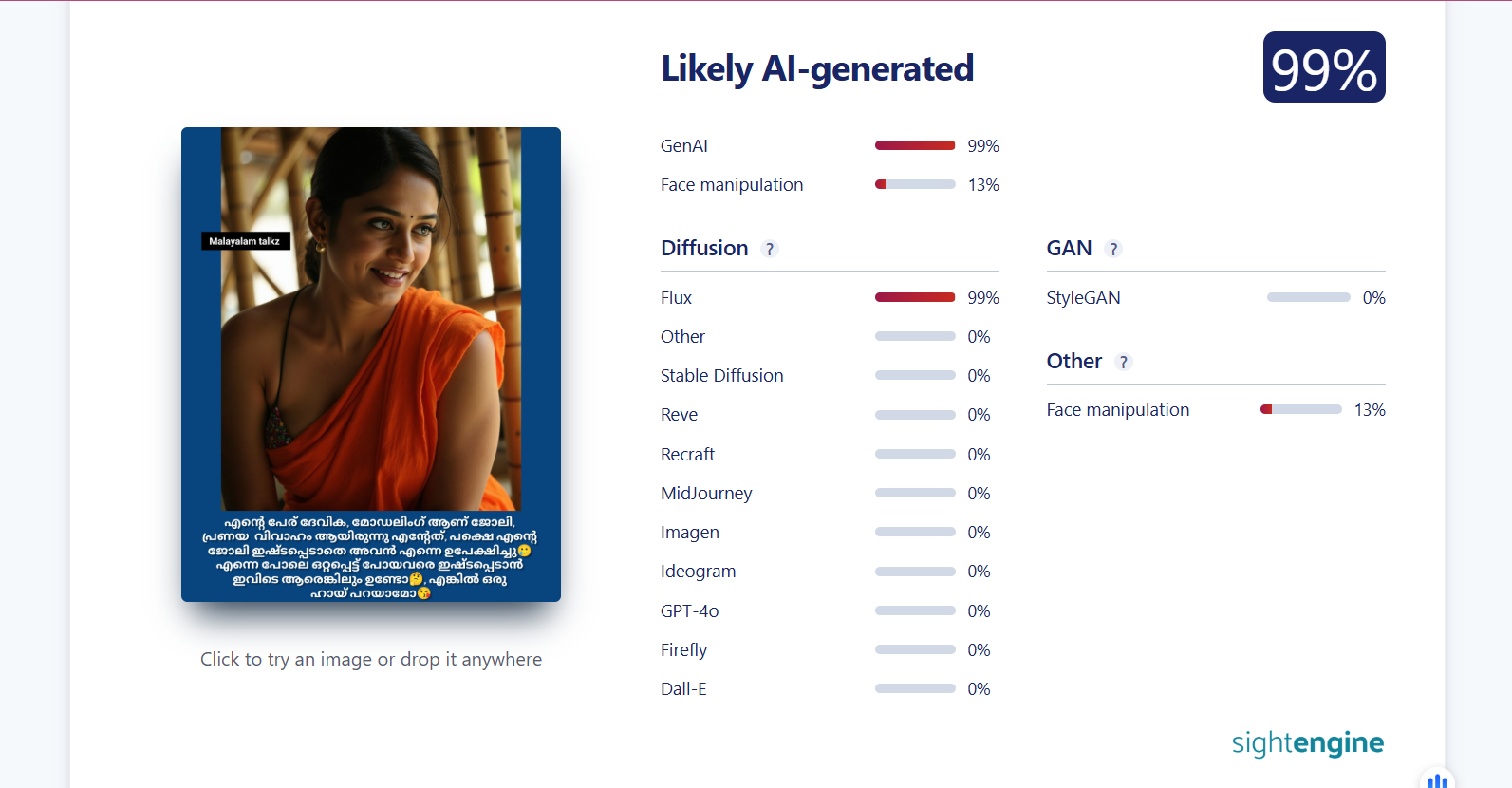 ചിത്രങ്ങൾ എഐ ആവാനുള്ള സാധ്യത 99% ആണെന്ന് സൈറ്റ് എഞ്ചിനിന്റെ പരിശോധനയിൽ കണ്ടെത്തി.