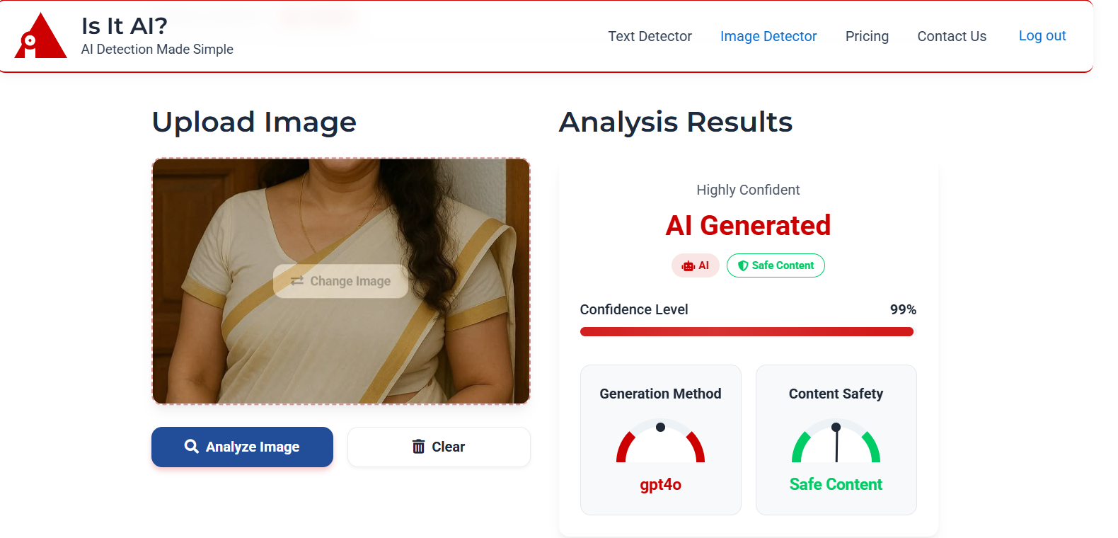 വാസ്ഇറ്റ് എഐ ടൂൾ പറഞ്ഞത് ചിത്രങ്ങൾ അല്ലെങ്കിൽ അവയുടെ ഒരു പ്രധാന ഭാഗം എഐ ആണ് സൃഷ്ടിച്ചതെന്ന് തികച്ചും ആത്മവിശ്വാസത്തോടെ പറയാൻ കഴിയുമെന്നാണ്.