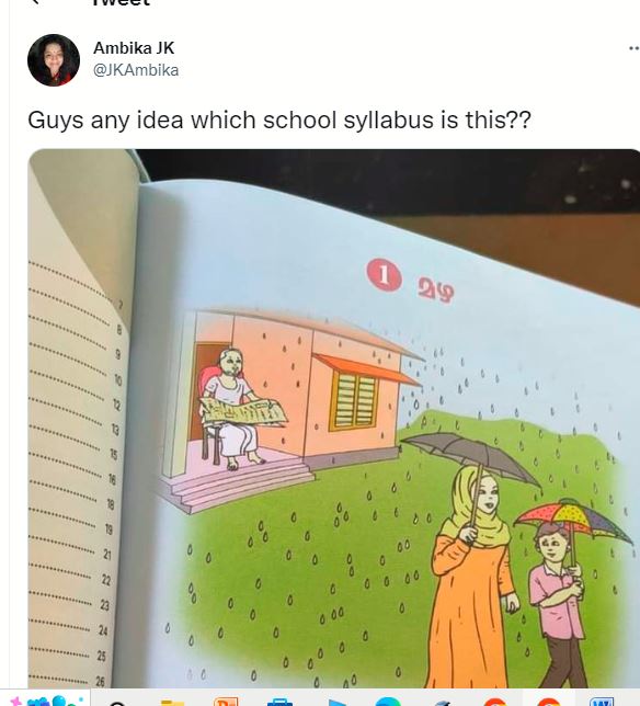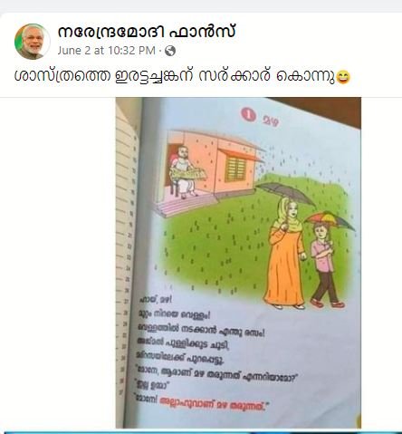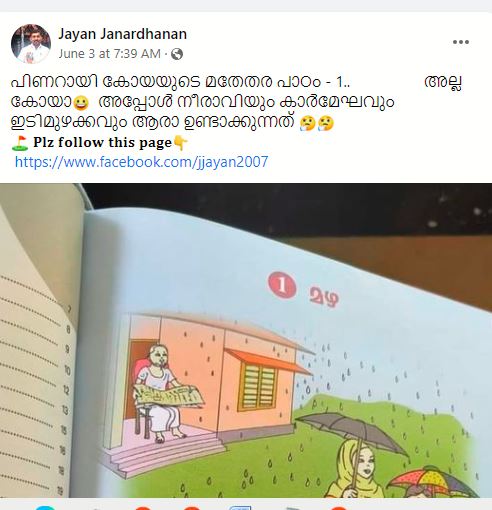 കേരള സർക്കാർ പുറത്തിറക്കിയ സ്റ്റേറ്റ് സിലബസ് പാഠപുസ്തകം എന്ന രീതിയിൽ ഒരു പാഠപുസ്തകം പ്രചരിക്കുന്നുണ്ട്. കേരളത്തിൽ സ്കൂളുകൾ തുറക്കുകയും മഴ സജീവമാക്കുകയും ചെയ്ത സാഹചര്യത്തിലാണ് ഈ പോസ്റ്റുകൾ. രണ്ടു വർഷത്തെ ഇടവേളയ്ക്ക് ശേഷമാണ് ജൂൺ ഒന്നിന് സ്ക്കൂളുകൾ സജീവമാക്കുന്നത്. കോവിഡ് മഹാമാരി പടർന്ന് പിടിച്ച സാഹചര്യത്തിൽ കഴിഞ്ഞ രണ്ട് അക്കാദമിക്ക് വർഷവും സ്കൂളുകൾ സജീവമായിരുന്നില്ല.