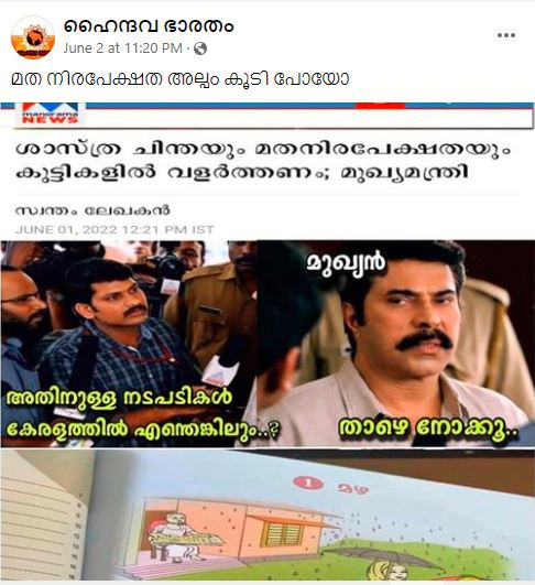 ഈ ചിത്രകഥയ്ക്കൊപ്പം പിണറായി വിജയന്റെ ഒരു പ്രസ്താവനയുള്ള മറ്റൊരു പടവും എടുത്തു ചേർതാണ് പ്രചരണം. ”ശാസ്ത്ര ചിന്തയും മത നിരപേക്ഷതയും കുട്ടികളിൽ വളർത്തണം,” എന്നാണ് പിണറായി ഈ പടത്തിൽ പറയുന്നത്.”ശാസ്ത്രത്തെ ഇരട്ടച്ചങ്കൻ സർക്കാർ കൊന്നു,” എന്ന അടിക്കുറിപ്പോടെയാണ് ഈ ചിത്രങ്ങൾ പ്രചരിപ്പിക്കുന്നത്.