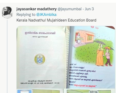 ഞങ്ങൾ JKAmbika ട്വീറ്റ് പരിശോധിച്ചപ്പോൾ അതിന് മറുപടിയായി jayumumbai എന്ന ആൾ ചെയ്ത ഒരു ട്വീറ്റ് ഞങ്ങളുടെ ശ്രദ്ധയിൽ വന്നു. കേരള നദ്വത്തുല് മുജാഹിദീന് എഡ്യൂക്കേഷൻ ബോർഡ് പുറത്തിറക്കുന്ന മദ്രസകളിൽ ഒന്നാം ക്ളാസിൽ പഠിപ്പിക്കുന്ന ഇസ്ലാമിക്ക് ബാലപാഠാവലിയാണ് ഇത് എന്ന് ചിത്രങ്ങൾ സഹിതം jayumumbai എന്ന ഹാൻഡിൽ മറുപടിയിൽ പറയുന്നു. കേരള നദ്വത്തുൽ മുജാഹിദീൻ കേരളത്തിലെ മുസ്ലിം വിഭാഗത്തിലെ ഒരു മതസംഘടനയാണ്.
