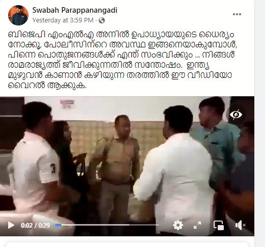 ”ബിജെപി എംഎൽഎ അനിൽ ഉപാധ്യായയുടെ ധൈര്യം നോക്കൂ, പോലീസിന്റെ അവസ്ഥ ഇങ്ങനെയാകുമ്പോൾ, പിന്നെ പൊതുജനങ്ങൾക്ക് എന്ത് സംഭവിക്കും. നിങ്ങൾ രാമരാജ്യത്ത് ജീവിക്കുന്നതിൽ സന്തോഷം. ഇന്ത്യ മുഴുവൻ കാണാൻ കഴിയുന്ന തരത്തിൽ ഈ വീഡിയോ വൈറൽ ആക്കുക,” എന്ന വിവരണത്തോടെ ഒരു ഫേസ്ബുക്ക് പോസ്റ്റ്.