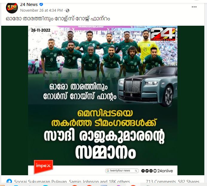സമൂഹ മാധ്യമങ്ങളിലും മുഖ്യധാരാ മാധ്യമങ്ങളിലും വ്യാപകമായി അർജന്റീനയ്ക്കെതിരായ സൗദിയുടെ ഞെട്ടിക്കുന്ന വിജയം ആഘോഷിച്ചു. അതിനെ തുടർന്ന് ഈ വിജയത്തിൽ സന്തുഷ്ടനായ സൗദി കിരീടാവകാശി മുഹമ്മദ് ബിൻ സൽമാൻ ടീമിലെ ഓരോ കളിക്കാരനും റോൾസ് റോയ്സ് ഫാന്റം സമ്മാനമായി നൽകി എന്ന പ്രചരണം ഉണ്ടായി. 24ന്യൂസ് എന്ന മലയത്തിലെ പ്രമുഖ ചാനൽ അടക്കം ഇതിനെ കുറിച്ച് വാര്ത്ത നൽകിയിരുന്നു. 18K റിയാക്ഷനുകളും 582 ഷെയറുകളും 713 കമന്റുകളുമാണ് 24ന്യൂസിന്റെ ഫേസ്ബുക്ക് പോസ്റ്റിന് ലഭിച്ചത്.