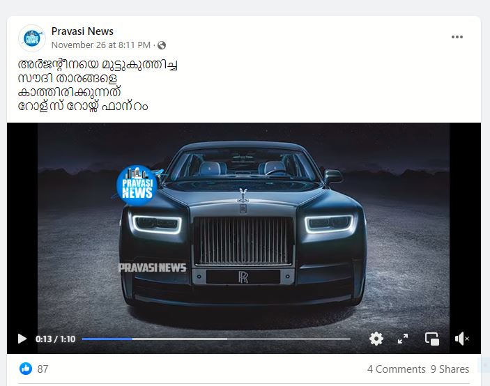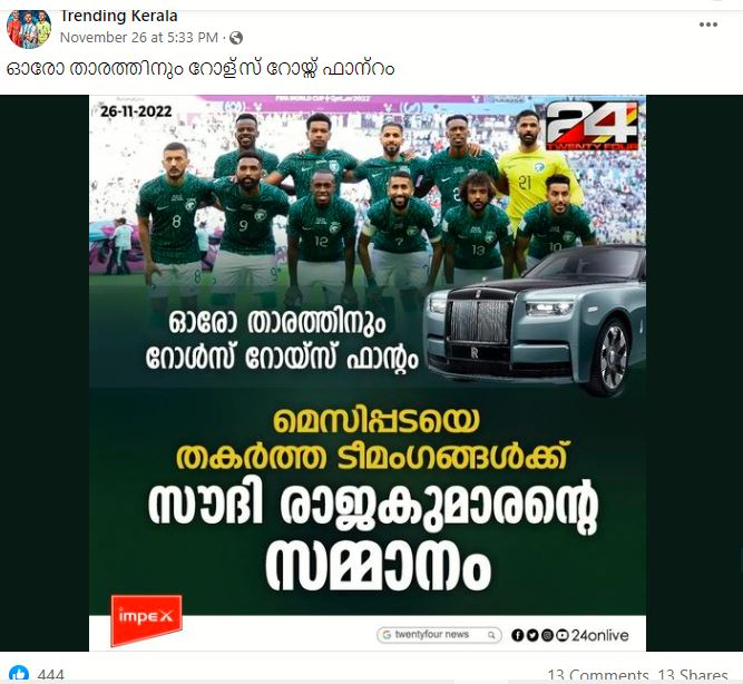 അർജന്റീനയ്ക്കെതിരായ സൗദിയുടെ ഞെട്ടിക്കുന്ന വിജയം ടീം അംഗങ്ങൾക്ക് റോൾസ് റോയ്സ് ഫാന്റം സമ്മാനമായി ലഭിക്കാൻ കാരണമായെന്ന് അവകാശപ്പെടുന്ന അടിസ്ഥാനരഹിതമായ സമൂഹ മാധ്യമ പോസ്റ്റ് മുഖ്യധാരാ മാധ്യമങ്ങൾ ഏറ്റെടുത്ത് വ്യാപകമായി റിപ്പോർട്ട് ചെയ്തു.