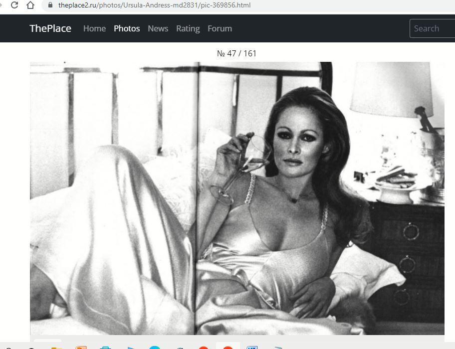 മധ്യഭാഗത്ത് കാണുന്ന ചിത്രവും സ്വിസ് നടി ഉർസുല ആൻഡ്രസിന്റേത് ആണ്. ചിത്രം 1962-ലെ ജെയിംസ് ബോണ്ട് ചലചിത്രമായ ഡോ. നമ്പർ സെറ്റിൽ നിന്നുള്ളതാണ്. ഇന്റർനെറ്റ് മൂവീസ് ഡാറ്റാബേസിൽ (IMDb) ഞങ്ങൾ ഈ ചിത്രം കണ്ടെത്തി.