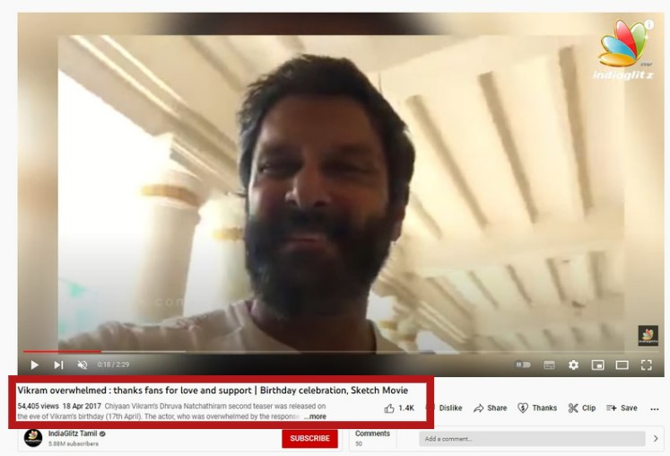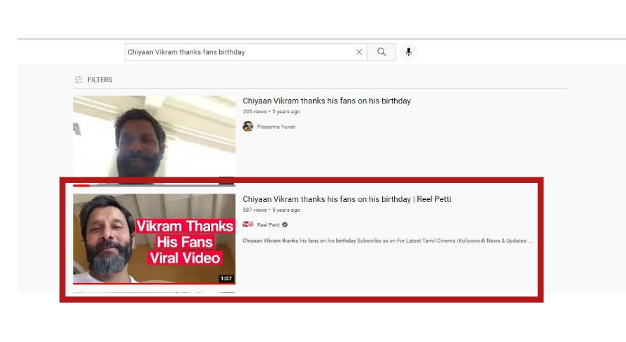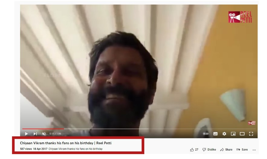 ഈ സൂചന സ്വീകരിച്ച് , ഞങ്ങൾ യൂട്യൂബിൽ “Chiyaan Vikram thanks fans birthday” എന്ന കീവേഡ് സെർച്ച് നടത്തി. ‘ചിയാൻ വിക്രം തന്റെ ജന്മദിനത്തിൽ ആരാധകർക്ക് നന്ദി പറയുന്നു’ എന്ന അടിക്കുറിപ്പോടെ 2017 ഏപ്രിൽ 18-ന് വെരിഫൈഡ് ചാനലായ Reel Petti അപ്ലോഡ് ചെയ്ത വീഡിയോയിലേക്ക് അത് ഞങ്ങളെ നയിച്ചു.