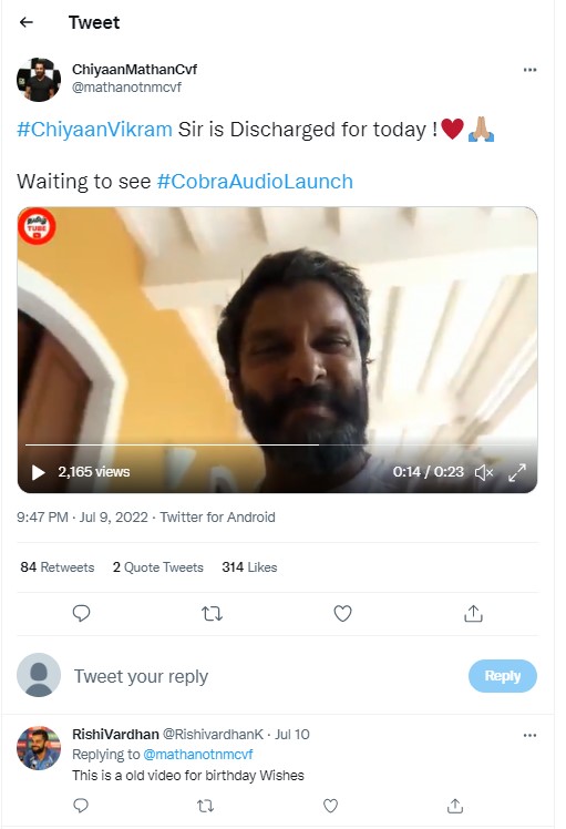 വീഡിയോയുടെ തുടക്കത്തിലെ കുറച്ച് നിമിഷങ്ങൾക്കകം തന്നെ, വിക്രം ആശുപത്രിയിൽ നിന്ന് ഡിസ്ചാർജ് ചെയ്തതിന് ശേഷം ആരാധകരോട് നന്ദി പറയുന്നുവെന്ന പേരിൽ വൈറലായ ക്ലിപ്പിൽ നിന്നുള്ള കീഫ്രെയിമുകൾ ഞങ്ങൾ കണ്ടെത്തി. വീഡിയോയിൽ, താരം ഇങ്ങനെ പറയുന്നത് കേൾക്കാം “ഹായ്, പീപ്പിൾ. ഓ എന്റെ ദൈവമേ! വളരെയധികം സ്നേഹം, വളരെയധികം വാത്സല്യം. ഇത് ഇതുവരെയുള്ള എന്റെ ഏറ്റവും മികച്ച ജന്മദിനമാണ്, എല്ലാത്തിനും നന്ദി.”