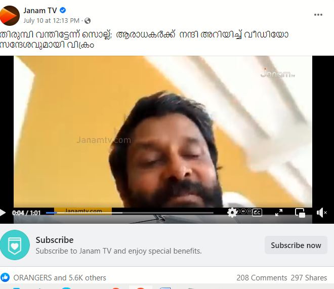 ചിയാൻ വിക്രം ആരാധകർക്ക് ആശംസ അറിയിക്കുന്ന വീഡിയോ വൈറലാവുന്നുണ്ട്. കഴിഞ്ഞയാഴ്ച ആശുപത്രിയിൽ പ്രവേശിപ്പിക്കപ്പെട്ടതിന്റെ റിപ്പോർട്ടുകൾ പുറത്തുവന്നതിന് ശേഷം സോഷ്യൽ മീഡിയ പ്ലാറ്റ്ഫോമുകളിൽ തമിഴ് സൂപ്പർസ്റ്റാർ വിക്രമിനായി പ്രാർത്ഥനകളും ആശംസകളും നിറഞ്ഞു. ‘ചിയാൻ’ എന്ന് ആരാധകർ വിളിക്കുന്ന വിക്രമിനെ നെഞ്ചിൽ അസ്വസ്ഥത അനുഭവപ്പെട്ടതിനെ തുടർന്ന് ആശുപത്രിയിൽ പ്രവേശിപ്പിക്കുകയും ഉടൻ തന്നെ ഡിസ്ചാർജ് ചെയ്യുകയും ചെയ്തു. ഇതിനെത്തുടർന്ന്, മലയാളം ടെലിവിഷൻ ചാനലായ ജനം ടിവി അവരുടെ ഫേസ്ബുക്ക് പേജിൽ, ‘തിരുമ്പി വന്തിട്ടേന്ന് സൊല്ല്; ആരാധകർക്ക് നന്ദി അറിയിച്ച് വീഡിയോ സന്ദേശവുമായി വിക്രം,എന്ന വിവരണത്തോടെ പങ്കിട്ടു.’ ഈ വീഡിയോയ്ക്ക് ഞങ്ങൾ കാണുമ്പോൾ, 297 ഷെയറുകൾ ഉണ്ടായിരുന്നു.