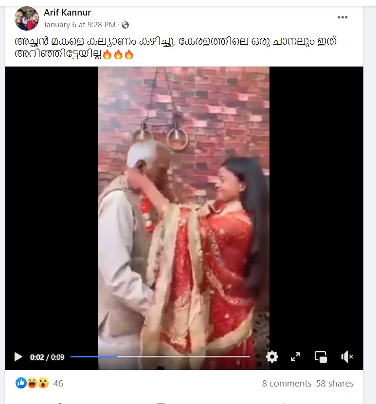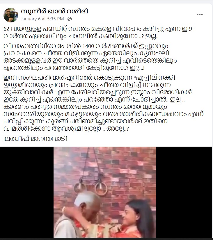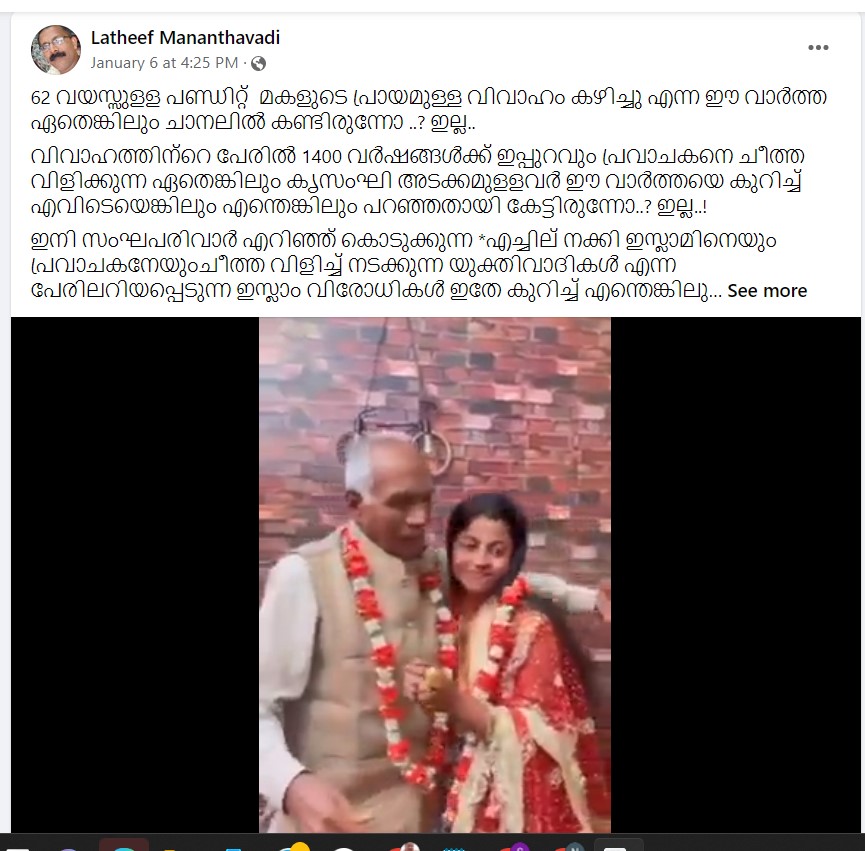 62 വയസ്സുളള ഹിന്ദു പണ്ഡിറ്റ് സ്വന്തം മകളെ വിവാഹം കഴിച്ചു എന്ന പേരിൽ ഒരു പ്രചരണം ഫേസ്ബുക്കിൽ നടക്കുന്നുണ്ട്.