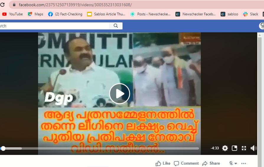 ആദ്യ പത്രസമ്മേളനത്തിൽ തന്നെ വർഗീയ കക്ഷിയായ ലീഗിനെ ലക്ഷ്യം വെച്ച് പുതിയ പ്രതിപക്ഷ നേതാവ് വിഡി.സതീശൻ എന്ന് വാദിക്കുന്ന ഒരു പോസ്റ്റ് സോഷ്യൽ മീഡിയയിൽ വൈറൽ ആവുന്നുണ്ട്.കോൺഗ്രസിനെ ലീഗിന്റെ തടവറയിൽ നിന്നും രക്ഷിക്കുമെന്ന് സതീശൻ പറഞ്ഞതായാണ് ആ പോസ്റ്റിൽ പറയുന്നത്. പ്രതിപക്ഷ നേതാവ് സ്ഥാനം അറിഞ്ഞ ശേഷം എറണാകുളം ഡി സി സി ആപ്പീസിൽ വെച്ച് പത്രസമ്മേളനം നടത്തി വി ഡി സതീശൻ പറഞ്ഞ കാര്യമാണ് ബഹുകേമം. ആദ്യമായി അദ്ദേഹം പറഞ്ഞത്, യുഡിഎഫിൻറെ പ്രഥമ പരിഗണന വർഗീയതയെ എതിർക്കലാണ്, ഭൂരിപക്ഷ, ന്യൂനപക്ഷ, വർഗീയതയെ എതിർക്കലാണ് എന്നാണ് വി ഡി സതീശൻ പറഞ്ഞിരിക്കുന്നത്, എന്നാണ് പോസ്റ്റ് പറയുന്നത്.പ്രണയം ചുവപ്പിനോട് മാത്രം എന്ന ഐ ഡിയിൽ നിന്നും ഇത് പോസ്റ്റ് ചെയ്തപ്പോൾ ഇതിനു 1.7 K വ്യൂവുകളുണ്ട്. എ കമ്മ്യൂണിസ്റ്റ് സക്സസ് എന്ന ഐ ഡിയിൽ നിന്നും ഇത് പോസ്റ്റ് ചെയ്തപ്പോൾ 4. 3 K വ്യവുകളും ഉണ്ട്.