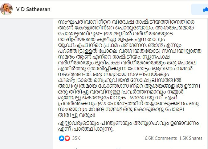 ഇതേ കാര്യം തന്റെ ഫേസ്ബുക്ക് പോസ്റ്റിലും സതീശൻ പറഞ്ഞിട്ടുള്ളതാണ്.സംഘപരിവാറിന്റെ വിദ്വേഷ രാഷ്ട്രീയത്തിനെതിരെ ആണ് കേരളത്തിന്റെ പൊതുബോധം. ആശയപരമായ പോരാട്ടത്തിലൂടെ ഈ മണ്ണിൽ വർഗീയതയുടെ രാഷ്ട്രീയത്തെ കുഴിച്ചു മൂടുക എന്നതാവും യു.ഡി.എഫിന്റെ പ്രഥമ പരിഗണന. ഞാൻ എന്നും പറഞ്ഞിട്ടുള്ളത് പോലെ വർഗീയതയോടു സന്ധിയില്ലാത്ത സമരം ആണ് എന്റെ രാഷ്ട്രീയം. ന്യൂനപക്ഷ വർഗീയതയും ഭൂരിപക്ഷ വർഗീയതയെയും ഒരു പോലെ എതിർത്തു തോൽപ്പിക്കുന്ന പോരാട്ടം ആവണം നമ്മൾ നടത്തേണ്ടത്. ഒരു സമുദായ സംഘടനയ്ക്കും കീഴ്പ്പെട്ടാതെ നെഹ്രുവിയൻ സോഷ്യലിസത്തിൽ അധിഷ്ഠിതമായ കോൺഗ്രസിന്റെ ആശയങ്ങളിൽ ഊന്നി ഒരു തിരിച്ചു വരവിനുള്ള പ്രവർത്തനമാവും നമ്മൾ മുന്നോട്ടു കൊണ്ടുപോവുക. ഈ ഫേസ്ബുക്ക് പോസ്റ്റ് കേരള കൗമുദി, മാധ്യമം തുടങ്ങിയ പത്രങ്ങൾ റിപ്പോർട്ട് ചെയ്തിട്ടുള്ളതാണ്.