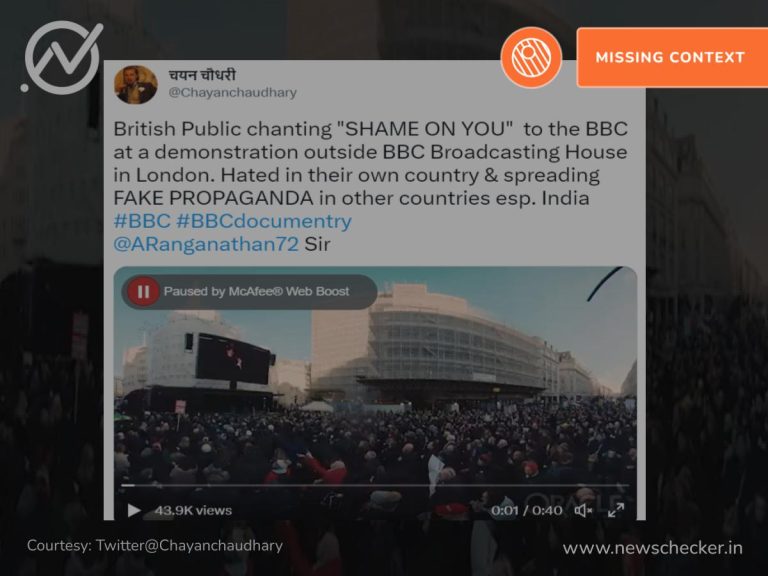 ബിബിസി ആസ്ഥാനത്തിന് പുറത്ത് നടന്ന പ്രതിഷേധം കാണിക്കുന്ന വൈറൽ വീഡിയോ 2002ലെ ഗുജറാത്ത് കലാപത്തെ കുറിച്ചുള്ള ബിബിസി ഡോക്യുമെന്ററിക്ക് എതിരെ നടന്നതല്ലെന്ന് ഞങ്ങളുടെ അന്വേഷണത്തിൽ മനസിലായി. കോവിഡ് വാക്സിന്റെ പരീക്ഷണ കുത്തിവെപ്പ് മൂലമുള്ള മരണങ്ങളും പരിക്കുകളും റിപ്പോർട്ട് ചെയ്യുന്നതിന് ബിബിസിയ്ക്ക് മേൽ സമ്മർദ്ദം ചെലുത്തുവാനാണ് പ്രതിഷേധം സംഘടിപ്പിച്ചത്.