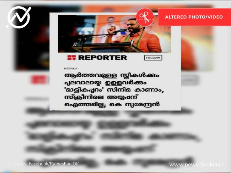 മാളികപ്പുറം സിനിമയെ കുറിച്ചുള്ള കെ സുരേന്ദ്രന്റെ പ്രസ്താവനയുടെ റിപ്പോർട്ടർ ടിവി ന്യൂസ്കാർഡ് വ്യാജമായി ഉണ്ടാക്കിയതാണ് എന്ന് ഞങ്ങളുടെ അന്വേഷണത്തിൽ തെളിഞ്ഞു.