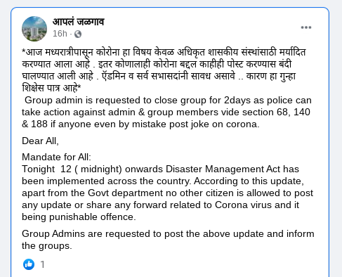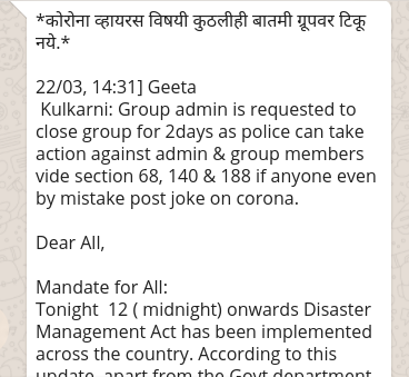 “ग्रुप अॅडमिनला 2 दिवसांसाठी ग्रुप बंद ठेवण्याची विनंती केली जात आहे, COVID-19 संदर्भात विनोद, माहिती शेअर केल्यास पोलिस अॅडमिन आणि ग्रुपमधील सदस्यांविरुद्ध कलम, 68, 140 आणि 88 नुसार कारवाई करु शकतात. जनादेश: आज रात्री 12 (मध्यरात्री) नंतर संपूर्ण देशात आपत्ती व्यवस्थापन कायदा लागू करण्यात आला आहे. या नुसार, शासकीय विभागांशिवाय इतर कोणत्याही नागरिकास COVID-19 विषाणूशी संबंधित कोणती पोस्ट करण्यास किंवा शेअर करण्यास परवानगी नाही, तसे करणे दंडनीय गुन्हा आहे. ग्रुप अॅडमिनना विनंती आहे की, त्यांनी याची माहिती आपल्या ग्रुपमध्ये द्यावी. कृपया या आदेशाचे काटेकरोपणे पालन करावे.”