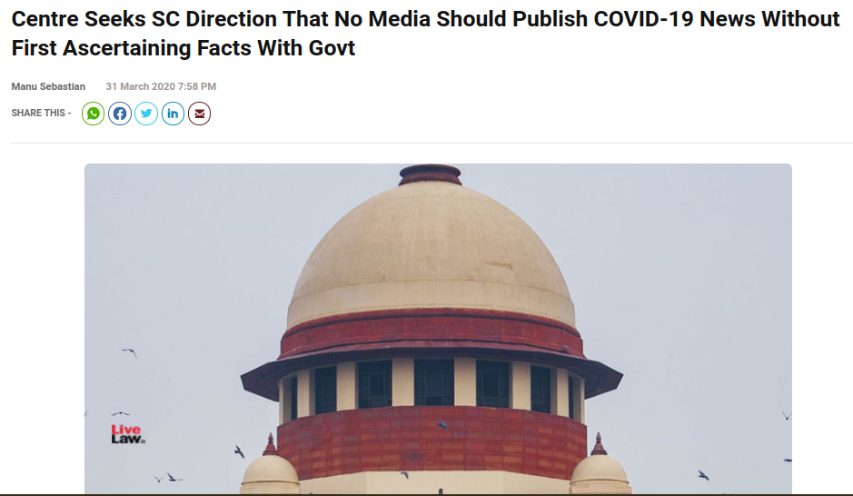 Live Law- https://www.livelaw.in/top-stories/centre-seeks-sc-direction-that-no-media-should-publish-covid-19-news-without-first-ascertaining-facts-with-govt-154601