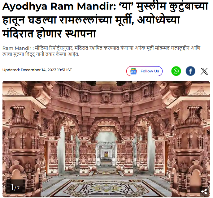 Aaj Tak ने २६ नोव्हेंबर २०२३ रोजी प्रसिद्ध केलेल्या बातमीत म्हटले आहे की, “अयोध्येतील भव्य राम मंदिराच्या उभारणीच्या कामाला अंतिम स्वरूप दिले जात आहे. येथील मंदिरात स्थापन करण्यात येणाऱ्या राम लल्लाच्या तीन मूर्ती जवळपास तयार झाल्या आहेत. डिसेंबर महिन्यात तीनपैकी एक मूर्तीची निवड होणार आहे.” आम्हाला येथे कोठेही मुस्लिम कारागीर कुटुंबीयांचा उल्लेख आढळला नाही.
