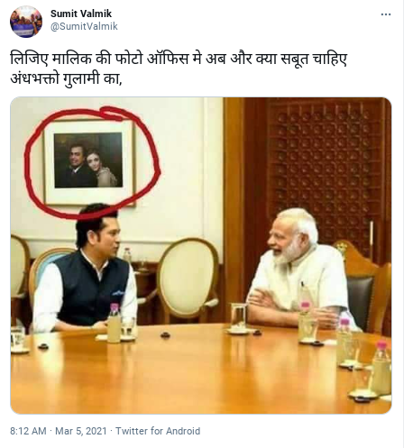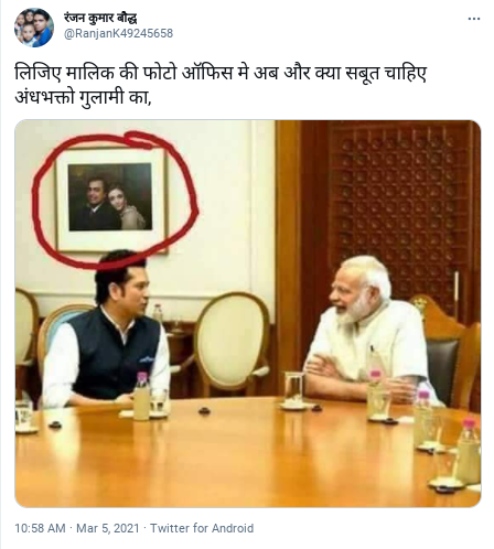 पंतप्रधान नरेंद्र मोदी आणि माजी क्रिकेटपटू सचिन तेंडुलकर यांचा फोटो सोशल मीडियात व्हायरल होत आहे. या फोटोत सचिनच्या मागे भिंतीवर मुकेश आणि नीता अंबानी यांचा फोटो दिसत आहे. मुकेश आणि नीता अंबानी यांचा फोटो पंतप्रधान कार्यालयात आहे असा दावा युजर्स करत आहेत.