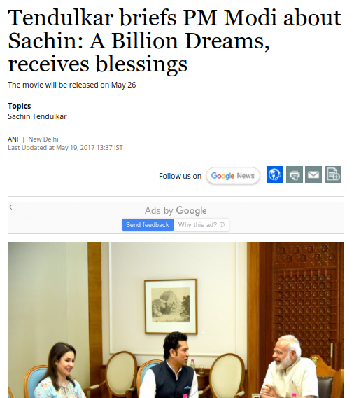 सचिनने पंतप्रधान नरेंद्र मोदी यांची कधी भेट घेतली आणि पंतप्रधान कार्यालयात मुकेश अंबानी आणि नीता अंबानी यांचा फोटो लावण्यात आला आहे याची पडताळणी करण्यास आम्ही सुरुवात केली. व्हायरल फोटो गूगल रिव्हर्स इमेजच्या साहाय्याने शोधला असता आम्हाला अनेक वेबसाईट्सवर मुळ फोटो आढळून आला. तसेच Business Standard च्या वेबसाईटवर 19 मे 2017 रोजीच्या एका न्यूज रिपोर्टमध्ये हा फोटो आढळून आला. यात म्हटले आहे की सचिन तेंडुलकरने पंतप्रधान नरेंद्र मोदी यांची भेट घेतली. ‘सचिन एक बिलियन ड्रिम्स’ या चित्रपटाविषयी त्याने पंतप्रधानांची भेट घेतल्याची माहिती यात देण्यात आली आहे.