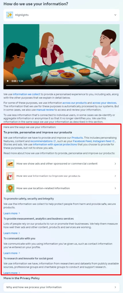 Facebook नवीन नियमांतर्गत युजर्सचे फोटो आणि इतर माहिती शेअर करत असल्याच्या दाव्याची चौकशी करण्यासाठी, आम्ही युजर्सनी शेअर केलेल्या पोस्ट आणि इतर माहितीच्या संदर्भात प्लॅटफॉर्मचे धोरण जाणून घेण्यासाठी फेसबुकच्या अधिकृत वेबसाइटवर शोध घेतला. फेसबुकच्या वेबसाइटवर, प्लॅटफॉर्मवर युजर्सनी शेअर केलेली माहिती, त्याचे मालकी हक्क, वापर आणि गोपनीयता याबद्दल तपशीलवार माहिती दिली आहे. प्लॅटफॉर्मच्या गोपनीयता धोरणानुसार, Facebook युजर्सच्या पोस्ट, मित्र सूची, अनुयायी आणि इतर नातेसंबंध, अॅप, ब्राउझर आणि डिव्हाइस माहिती आणि विक्रेते, भागीदार आणि थर्ड पार्टी कंपन्यांद्वारे शेयर केलेली माहिती गोळा करू शकते. प्लॅटफॉर्म ही माहिती सुरक्षा, उद्योगाशी संबंधित सेवा, आकडेवारी, संवाद आणि सामाजिक कार्यासाठी संशोधन इत्यादी कारणांसाठी वापरते. हे लक्षात घेण्यासारखे आहे की काही माहिती आहे जी आम्हाला फेसबुकवर शेअर करायची आहे. तथापि, युजर्स त्यांची सेटिंग्ज बदलून फेसबुकसह कोणती माहिती शेयर करतात यावर नियंत्रण ठेवू शकतात. याशिवाय, प्लॅटफॉर्म ही सुविधा देखील प्रदान करते जिथे युजर्स त्यांच्या गोपनीयतेची सुरक्षितता जाणून घेऊ शकतात आणि ती अधिक मजबूत करू शकतात.