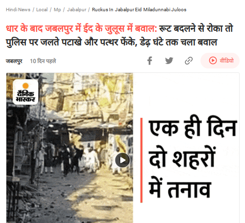याशिवाय आम्हाला दैनिक भास्करची देखील बातमी आढळून आली. यात म्हटले की, धारनंतर जबलपूरमध्ये ईद मिलादुन्नबीच्या मिरवणुकीवरून वाद झाला आहे. येथे मिरवणूक काढणाऱ्या समजावल्नेयानंतरही पोलिसांवर जळते फटाके फेकले आणि दगडफेक केली. पोलिसांना सौम्य बळाचा वापरही करावा लागला. त्यांनी अश्रुधुराच्या नळकांड्या फोडून जमावाला पांगवले.