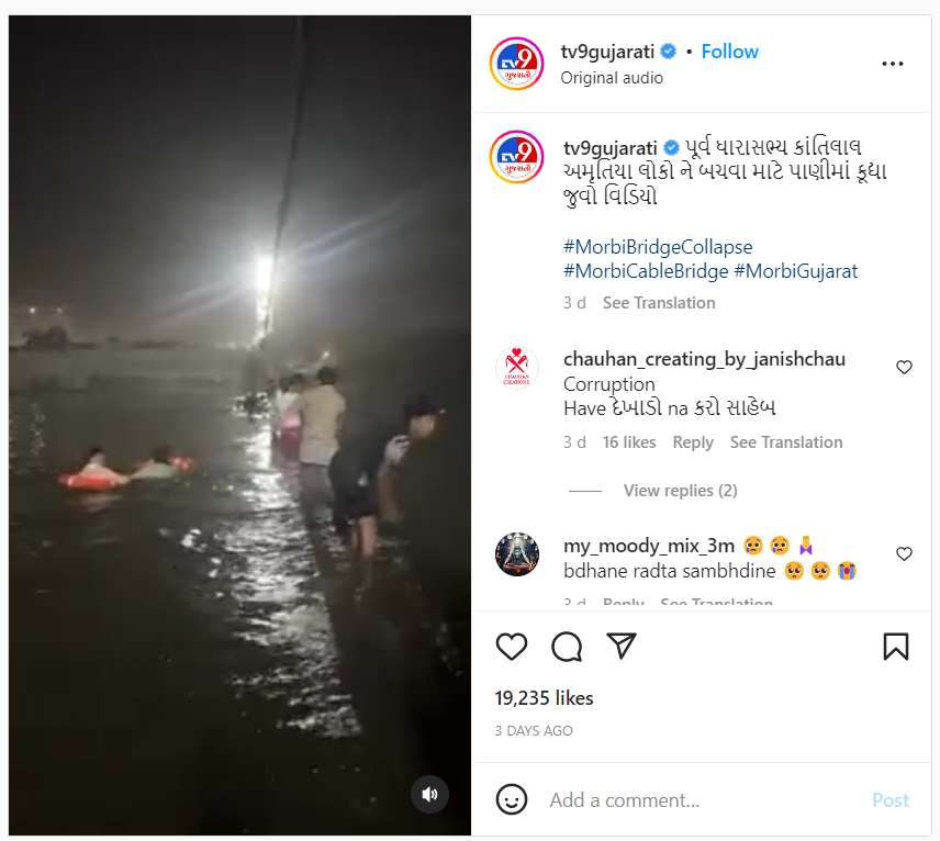 गुजरातमधील मोरबी येथे झालेल्या अपघाताचा एक व्हिडिओ सोशल मीडियावर व्हायरल होत आहे.व्हिडिओमध्ये एक व्यक्ती ट्यूबच्या मदतीने पाण्यात तरंगताना दिसत आहे.ही व्यक्ती मोरबी येथील काँग्रेस आमदार ब्रिजेश मेरजा असल्याचा आणि अपघातानंतर गुडघाभर पाण्यात पोहून मदतकार्य करण्याची नौटंकी करीत असल्याचा दावा केला जात आहे.
