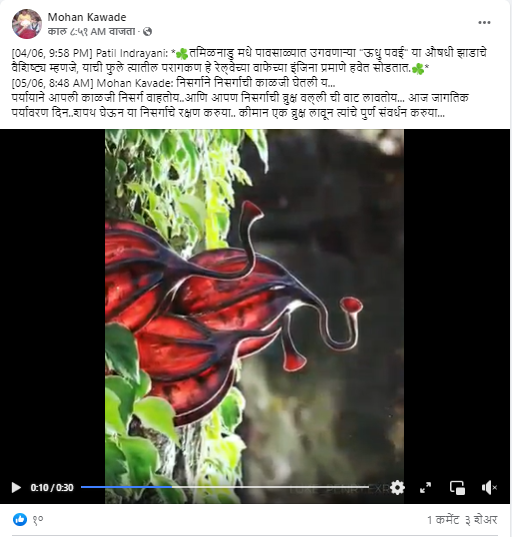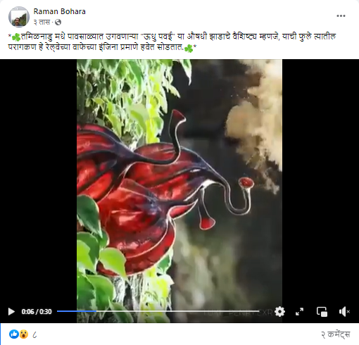 फेसबुकवर ही पोस्ट व्हायरल होत आहे. “तमिळनाडु मधे पावसाळ्यात उगवणाऱ्या ‘ऊधु पवई’ या औषधी झाडाचे वैशिष्ट्य म्हणजे, याची फुले त्यातील परागकण हे रेल्वेच्या वाफेच्या इंजिना प्रमाणे हवेत सोडतात.” असं त्या पोस्टमध्ये लिहिलं होतं.