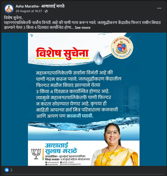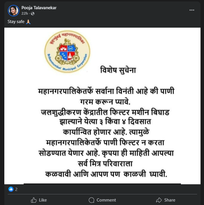 “विशेष सुचना महानगरपालिकेतर्फे सर्वाना विनंती आहे की पाणी गरम करून प्यावे. जलशुद्धीकरण केंद्रातील फिल्टर मशीन बिघाड झाल्याने येत्या ३ किंवा ४ दिवसात कार्यान्वित होणार आहे. त्यामुळे महानगरपालिकेतर्फे पाणी फिल्टर न करता सोडण्यात येणार आहे. कृपया ही माहिती आपल्या सर्व मित्र परिवाराला कळवावी आणि आपण पण काळजी घ्यावी.” असा मूळ मेसेज आहे.
