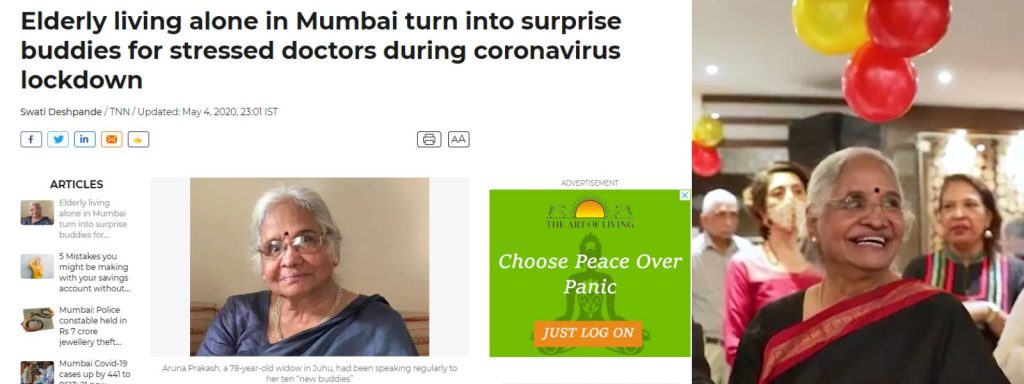 न्यूजचेकरने चित्रांवर Google रिव्हर्स इमेज सर्च केले आणि टाइम्स ऑफ इंडियाने 4 मे 2020 रोजी अपलोड केलेला एक लेख सापडला. लेखानुसार, महिलेची ओळख अरुणा प्रकाश अशी आहे, त्या 78 वर्षांच्या असून ती जुहू येथे राहतात. स्वयंसेवकांपैकी एक असून त्या डॉक्टर आणि वृद्धांना मदत करण्याच्या उद्देशाने नवीन हेल्पलाइनमध्ये कोविड बाधित रुग्णांचे मनोधैर्य वाढविण्यासाठी काम करतात.