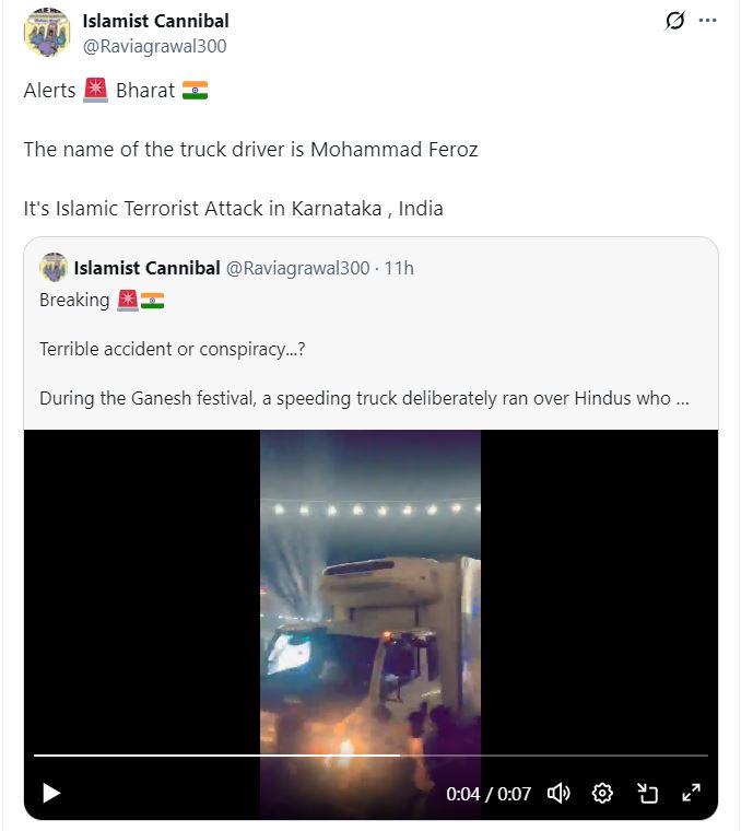 कर्नाटकातील हासन जिल्ह्यात गणेश विसर्जन मिरवणुकीदरम्यान झालेल्या दुर्दैवी ट्रक अपघाताला सोशल मीडियावर जातीय रंग दिला जात आहे. अनेक युजर्स असा दावा करत आहेत की हसनमधील गणेश विसर्जन अपघातातील आरोपी ट्रक चालक मुस्लिम आहे आणि त्याचे नाव मोहम्मद फिरोज आहे.