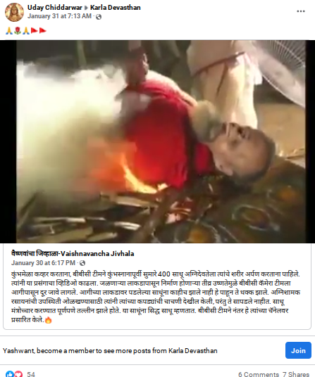 व्हायरल पोस्टमध्ये म्हटले आहे की, “कुंभमेळा कव्हर करताना, बीबीसी टीमने कुंभस्नानापूर्वी सुमारे 400 साधू अग्निदेवतेला त्यांचे शरीर अर्पण करताना पाहिले. त्यांनी या प्रसंगाचा व्हिडिओ काढला. जळणाऱ्या लाकडापासून निर्माण होणाऱ्या तीव्र उष्णतेमुळे बीबीसी कॅमेरा टीमला आगीपासून दूर जावे लागले. आगीच्या लाकडावर पडलेल्या साधूंना काहीच झाले नाही हे पाहून ते थक्क झाले. अग्निशामक रसायनांची उपस्थिती ओळखण्यासाठी त्यांनी त्यांच्या कपड्यांची चाचणी देखील केली, परंतु ते सापडले नाहीत. साधू मंत्रोच्चार करण्यात पूर्णपणे तल्लीन झाले होते. या साधूंना सिद्ध साधू म्हणतात. बीबीसी टीमने नंतर हे त्यांच्या चॅनेलवर प्रसारित केले.”