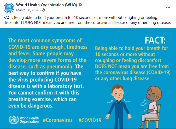 ਸੋਸ਼ਲ ਮੀਡੀਆ ਤੇ ਕੋਰੋਨਾ ਵਾਇਰਸ ਨੂੰ ਲੈ ਕੇ ਕਈ ਤਰ੍ਹਾਂ ਦੀਆਂ ਗੁੰਮਰਾਹਕੁੰਨ ਪੋਸਟਾਂ ਵਾਇਰਲ ਹੋ ਰਹੀਆਂ ਹਨ। ਇਸ ਦੌਰਾਨ ਸੋਸ਼ਲ ਮੀਡੀਆ ਤੇ ਇਕ ਦਾਅਵਾ ਵਾਇਰਲ ਹੋ ਰਿਹਾ ਹੈ ਜਿਸ ਮੁਤਾਬਕ ਜੇਕਰ ਕੋਈ ਵਿਅਕਤੀ 20 ਸਕਿੰਟ ਤਕ ਸਾਹ ਰੋਕ ਸਕਦਾ ਹੈ ਤਾਂ ਇਸ ਦਾ ਮਤਲਬ ਹੈ ਕਿ ਉਹ ਵਿਅਕਤੀ ਕੋਰੋਨਾ ਵਾਇਰਸ ਤੋਂ ਮੁਕਤ ਹੈ।