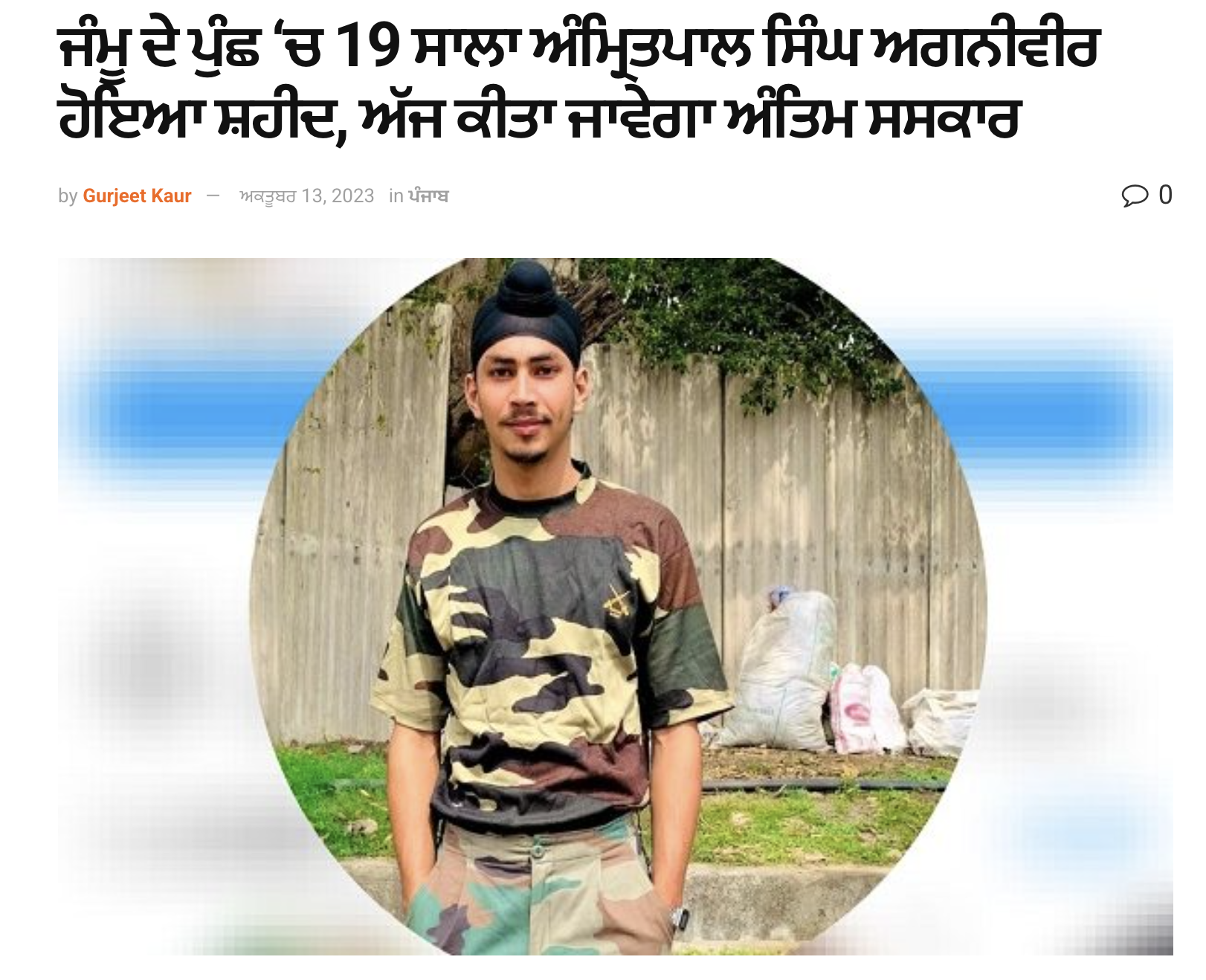 ਆਰਟੀਕਲ ਦੇ ਸਿਰਲੇਖ ਮੁਤਾਬਕ,”ਜੰਮੂ ਦੇ ਪੁੰਛ ‘ਚ 19 ਸਾਲਾ ਅੰਮ੍ਰਿਤਪਾਲ ਸਿੰਘ ਅਗਨੀਵੀਰ ਸ਼ਹੀਦ ਹੋਗਿਆ ਜਿਸ ਦਾ ਅੰਤਿਮ ਸਸਕਾਰ ਅੱਜ ਕੀਤਾ ਜਾਵੇਗਾ।”