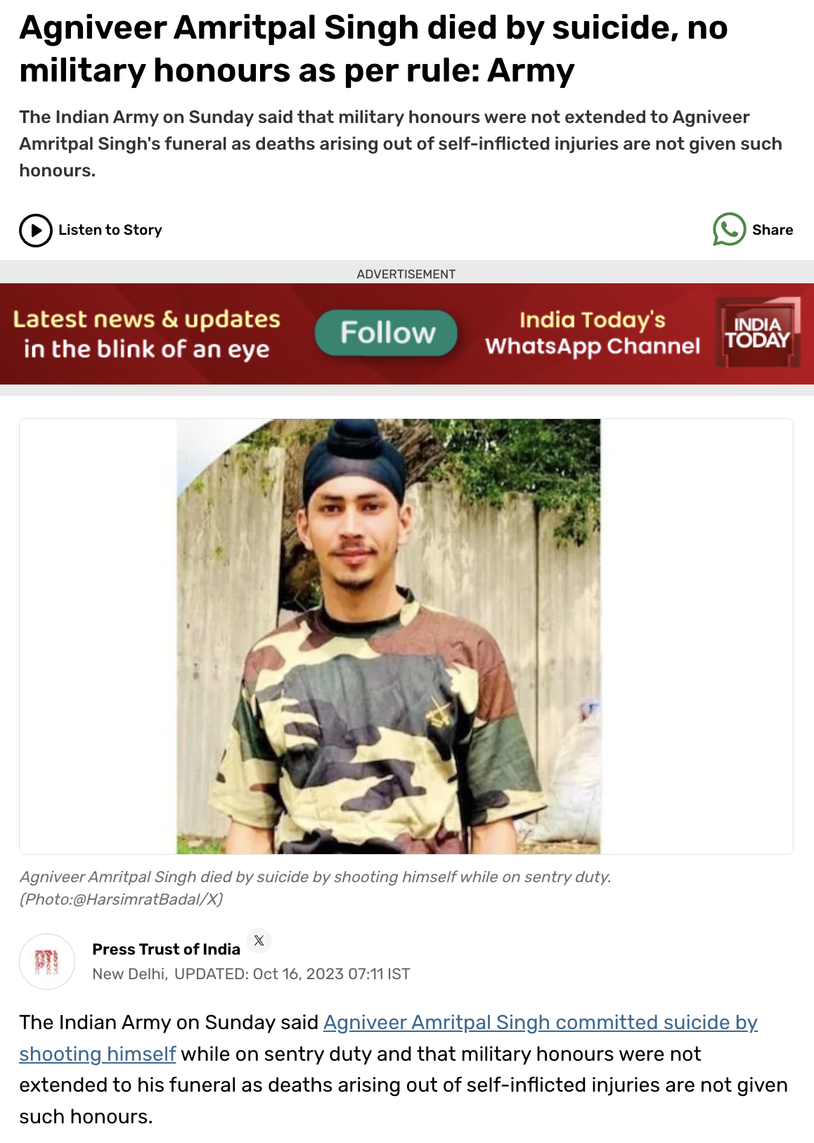ਪੜਤਾਲ ਨੂੰ ਅੱਗੇ ਵਧਾਉਂਦੇ ਹੋਏ ਸਾਨੂੰ ਇੰਡੀਆ ਟੁਡੇ ਦੁਆਰਾ 16 ਅਕਤੂਬਰ 2023 ਨੂੰ ਪ੍ਰਕਾਸ਼ਿਤ ਰਿਪੋਰਟ ਮਿਲੀ। ਇੰਡੀਆ ਟੁਡੇ ਨੇ ਮੀਡਿਆ ਏਜੇਂਸੀ “ਪੀਟੀਆਈ’ ਦੇ ਹਵਾਲੇ ਤੋਂ ਪ੍ਰਕਸ਼ਿਤ ਰਿਪੋਰਟ ਵਿਚ ਦੱਸਿਆ ਕਿ ਭਾਰਤੀ ਫੌਜ ਨੇ ਐਤਵਾਰ ਨੂੰ ਕਿਹਾ ਕਿ ਅਗਨੀਵੀਰ ਅੰਮ੍ਰਿਤਪਾਲ ਸਿੰਘ ਨੇ ਸੈਂਟਰੀ ਡਿਊਟੀ ਦੌਰਾਨ ਆਪਣੇ ਆਪ ਨੂੰ ਗੋਲੀ ਮਾਰ ਕੇ ਖੁਦਕੁਸ਼ੀ ਕਰ ਲਈ ਸੀ। ਫੌਜ ਨੇ ਇਹ ਵੀ ਕਿਹਾ ਕਿ ‘ਬਣਦੇ ਲਾਭਾਂ ਅਤੇ ਪ੍ਰੋਟੋਕੋਲਾਂ ਆਦਿ ਦੇ ਸਬੰਧ ਵਿੱਚ ਹਥਿਆਰਬੰਦ ਬਲ ਉਨ੍ਹਾਂ ਸਿਪਾਹੀਆਂ ਵਿੱਚ ਫਰਕ ਨਹੀਂ ਕਰਦੇ ਜੋ ਅਗਨੀਪਥ ਸਕੀਮ ਨੂੰ ਲਾਗੂ ਕਰਨ ਤੋਂ ਪਹਿਲਾਂ ਜਾਂ ਬਾਅਦ ਵਿੱਚ ਸ਼ਾਮਲ ਹੋਏ ਸਨ।’
