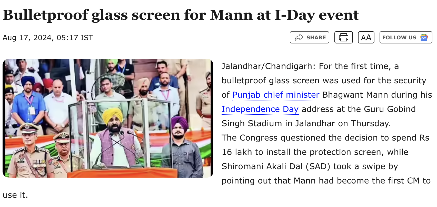 ਸਰਚ ਦੇ ਦੌਰਾਨ ਸਾਨੂੰ ਇਹ ਤਸਵੀਰ ਟਾਈਮਜ਼ ਆਫ ਇੰਡੀਆ ਦੁਆਰਾ ਅਗਸਤ 17, 2024 ਨੂੰ ਪ੍ਰਕਾਸ਼ਿਤ ਆਰਟੀਕਲ ਦੇ ਵਿੱਚ ਵਾਇਰਲ ਹੋ ਰਹੀ ਤਸਵੀਰ ਅਪਲੋਡ ਮਿਲੀ। ਇਸ ਰਿਪੋਰਟ ਦੇ ਮੁਤਾਬਕ, ਪਹਿਲੀ ਵਾਰ ਪੰਜਾਬ ਦੇ ਮੁੱਖ ਮੰਤਰੀ ਭਗਵੰਤ ਮਾਨ ਦੀ ਸੁਰੱਖਿਆ ਲਈ ਬੁਲੇਟਪਰੂਫ ਸ਼ੀਸ਼ੇ ਦੀ ਸਕਰੀਨ ਦੀ ਵਰਤੋਂ ਵੀਰਵਾਰ ਨੂੰ ਜਲੰਧਰ ਦੇ ਗੁਰੂ ਗੋਬਿੰਦ ਸਿੰਘ ਸਟੇਡੀਅਮ ਵਿੱਚ ਉਨ੍ਹਾਂ ਦੇ ਆਜ਼ਾਦੀ ਦਿਵਸ ਦੇ ਭਾਸ਼ਣ ਦੌਰਾਨ ਕੀਤੀ ਗਈ। ਕਾਂਗਰਸ ਨੇ ਸੁਰੱਖਿਆ ਸਕਰੀਨ ਲਗਾਉਣ ਲਈ 16 ਲੱਖ ਰੁਪਏ ਖਰਚ ਕਰਨ ਦੇ ਫੈਸਲੇ ‘ਤੇ ਸਵਾਲ ਉਠਾਏ, ਜਦੋਂ ਕਿ ਸ਼੍ਰੋਮਣੀ ਅਕਾਲੀ ਦਲ ਨੇ ਇਹ ਕਹਿ ਕੇ ਨਿਸ਼ਾਨਾ ਬਣਾਇਆ ਕਿ ਮਾਨ ਇਸਦੀ ਵਰਤੋਂ ਕਰਨ ਵਾਲੇ ਪਹਿਲੇ ਮੁੱਖ ਮੰਤਰੀ ਬਣੇ ਹਨ।