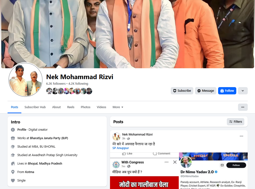 ਫੇਸਬੁੱਕ ‘ਤੇ ਦਿੱਤੀ ਗਈ ਜਾਣਕਾਰੀ ਵਿੱਚ ਨੇਕ ਮੁਹੰਮਦ ਰਿਜ਼ਵੀ ਨੇ ਆਪਣੇ ਆਪ ਨੂੰ ਮੱਧ ਪ੍ਰਦੇਸ਼ ਭਾਜਪਾ ਦਾ ਵਰਕਰ ਦੱਸਿਆ ਹੈ। ਇਸ ਤੋਂ ਇਲਾਵਾ, ਮੱਧ ਪ੍ਰਦੇਸ਼ ਦੇ ਕਈ ਭਾਜਪਾ ਨੇਤਾਵਾਂ ਨਾਲ ਉਸਦੀ ਤਸਵੀਰ ਵੀ ਮੌਜੂਦ ਹੈ।