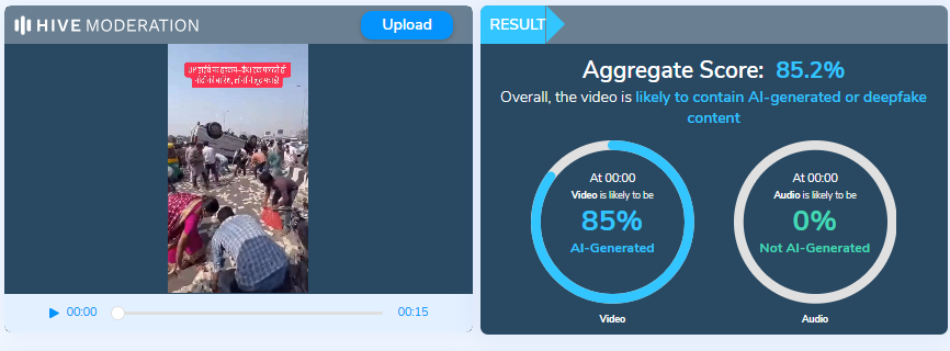 ਅਸੀਂ Hive Moderation ਅਤੇ WasItAI ਵਰਗੇ AI ਟੂਲਸ ਦੀ ਵਰਤੋਂ ਕਰਕੇ ਵਾਇਰਲ ਵੀਡੀਓ ਦੇ ਮੁੱਖ ਫਰੇਮਾਂ ਦਾ ਵਿਸ਼ਲੇਸ਼ਣ ਕੀਤਾ। ਟੂਲਸ ਨੇ ਵੀਡੀਓ ਦਾ ਵਿਸ਼ਲੇਸ਼ਣ ਕੀਤਾ ਅਤੇ ਇਸ ਨੂੰ AI-ਜਨਰੇਟਡ ਦੱਸਿਆ।