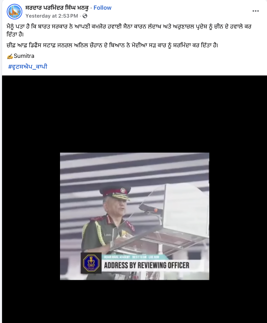 ਚੀਫ਼ ਆਫ਼ ਡਿਫੈਂਸ ਸਟਾਫ਼ (ਸੀਡੀਐਸ) ਜਨਰਲ ਅਨਿਲ ਚੌਹਾਨ ਦਾ ਇੱਕ ਵੀਡੀਓ ਸੋਸ਼ਲ ਮੀਡੀਆ ‘ਤੇ ਵਾਇਰਲ ਹੋ ਰਿਹਾ ਹੈ, ਜਿਸ ਵਿੱਚ ਉਨ੍ਹਾਂ ਨੂੰ ਕਥਿਤ ਤੌਰ ‘ਤੇ ਇਹ ਕਹਿੰਦੇ ਸੁਣਿਆ ਜਾ ਸਕਦਾ ਹੈ ਕਿ ਭਾਰਤ ਸਰਕਾਰ ਨੇ ਕਮਜ਼ੋਰ ਹਵਾਈ ਫੋਰਸ ਦੇ ਕਾਰਨ ਅਰੁਣਾਚਲ ਪ੍ਰਦੇਸ਼ ਅਤੇ ਲੱਦਾਖ ਨੂੰ ਚੀਨ ਦੇ ਸਾਮ੍ਹਣੇ ਸਰੈਂਡਰ ਕਰ ਦਿੱਤਾ ਹੈ।