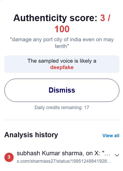 ਨਿਊਜ਼ਚੈਕਰ ਨੇ ਦੋ ਵੱਖ-ਵੱਖ ਡੀਪਫੇਕ ਡਿਟੈਕਸ਼ਨ ਟੂਲਸ ਦੀ ਵਰਤੋਂ ਕਰਕੇ ਵਾਇਰਲ ਕਲਿੱਪ ਦਾ ਵਿਸ਼ਲੇਸ਼ਣ ਕੀਤਾ ਅਤੇ ਦੋਵਾਂ ਟੂਲ ਨੇ ਪੁਸ਼ਟੀ ਕੀਤੀ ਕਿ ਆਡੀਓ ਨਾਲ ਛੇੜਛਾੜ ਕੀਤੀ ਗਈ ਹੈ। ਹਿਆ ਡੀਪਫੇਕ ਵੌਇਸ ਡਿਟੈਕਟਰ ਨੇ ਆਡੀਓ ਨੂੰ 100 ਵਿੱਚੋਂ ਸਿਰਫ਼ 3 ਪ੍ਰਮਾਣਿਕਤਾ ਸਕੋਰ ਦਿੱਤਾ, ਜੋ ਕਿ ਏਆਈ ਹੇਰਾਫੇਰੀ ਦੀ ਸੰਭਾਵਨਾ ਨੂੰ ਦਰਸਾਉਂਦਾ ਹੈ।