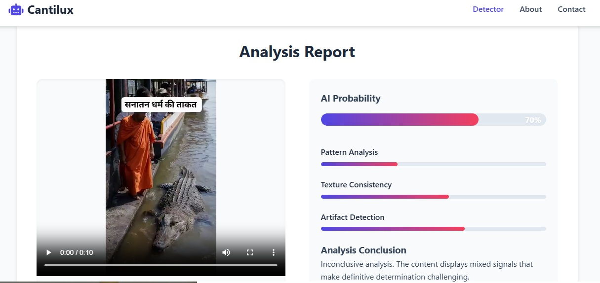 ਅਸੀਂ ਵੱਖ ਵੱਖ ਏਆਈ ਡਿਟੈਕਸ਼ਨ ਟੂਲਜ਼ ਦੀ ਮਦਦ ਨਾਲ ਵੀਡੀਓ ਦੀ ਜਾਂਚ ਕੀਤੀ। ਅਸੀਂ ਕੈਂਟਿਲਕਸ ਟੂਲ ਦੀ ਮਦਦ ਨਾਲ ਜਾਂਚ ਕੀਤੀ ਜਿਸ ਨੇ ਇਸ ਵੀਡੀਓ ਦੇ AI ਹੋਣ ਦੀ 70% ਸੰਭਾਵਨਾ ਪਾਈ।