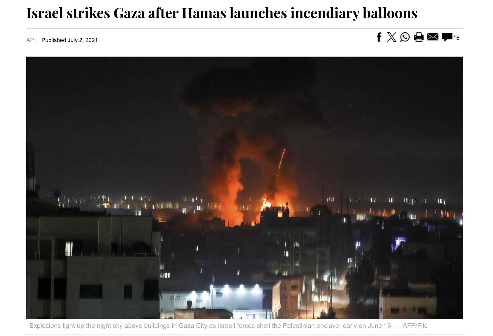 ਤਸਵੀਰ ਨਾਲ ਦਿੱਤੇ ਕੈਪਸ਼ਨ ਮੁਤਾਬਕ,”16 ਜੂਨ ਦੀ ਸਵੇਰ ਨੂੰ ਇਜ਼ਰਾਈਲੀ ਫੌਜਾਂ ਨੇ ਫਲਸਤੀਨੀ ਇਲਾਕੇ ‘ਤੇ ਗੋਲੀਬਾਰੀ ਕੀਤੀ, ਜਿਸ ਨਾਲ ਗਾਜ਼ਾ ਸ਼ਹਿਰ ਵਿੱਚ ਧਮਾਕੇ ਹੋਏ। ਇਸ ਤਸਵੀਰ ਲਈ AFP ਨੂੰ ਕਰੈਡਿਟ ਦਿੱਤੇ ਗਏ ਹਨ।