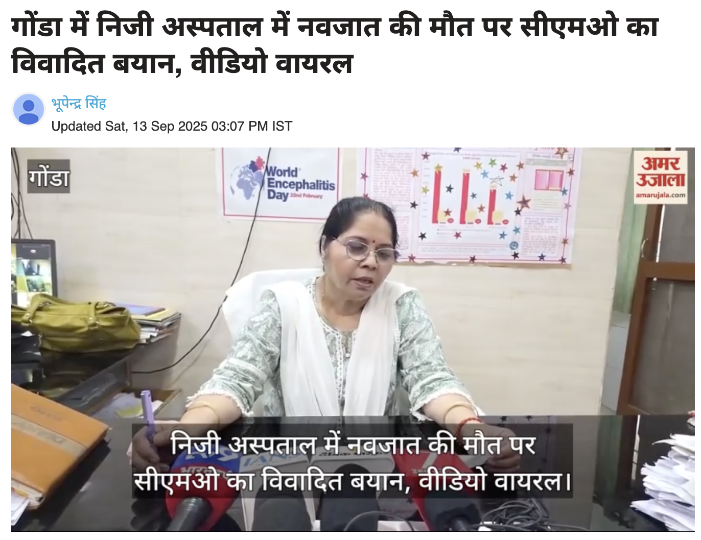 ਸਰਚ ਦੇ ਦੌਰਾਨ ਸਾਨੂੰ ਅਮਰ ਉਜਾਲਾ ਦੁਆਰਾ 13 ਸਿਤੰਬਰ 2025 ਨੂੰ ਪ੍ਰਕਾਸ਼ਿਤ ਆਰਟੀਕਲ ਮਿਲਿਆ। ਰਿਪੋਰਟ ਦੇ ਮੁਤਾਬਕ, ਗੋਂਡਾ ਦੇ ਇੱਕ ਗੈਰ-ਕਾਨੂੰਨੀ ਢੰਗ ਨਾਲ ਚਲਾਏ ਜਾ ਰਹੇ ਹਸਪਤਾਲ ਵਿੱਚ ਦੋ ਨਵਜੰਮੇ ਬੱਚਿਆਂ ਦੀ ਮੌਤ ਨੂੰ ਲੈ ਕੇ ਸੀਐਮਓ ਡਾ. ਰਸ਼ਿਮ ਵਰਮਾ ਦਾ ਇੱਕ ਵਿਵਾਦਪੂਰਨ ਬਿਆਨ ਸਾਹਮਣੇ ਆਇਆ ਹੈ। ਉਨ੍ਹਾਂ ਦਾ ਅੱਠ ਸਕਿੰਟ ਦਾ ਵੀਡੀਓ ਸੋਸ਼ਲ ਮੀਡੀਆ ‘ਤੇ ਵਾਇਰਲ ਹੋ ਰਿਹਾ ਹੈ।