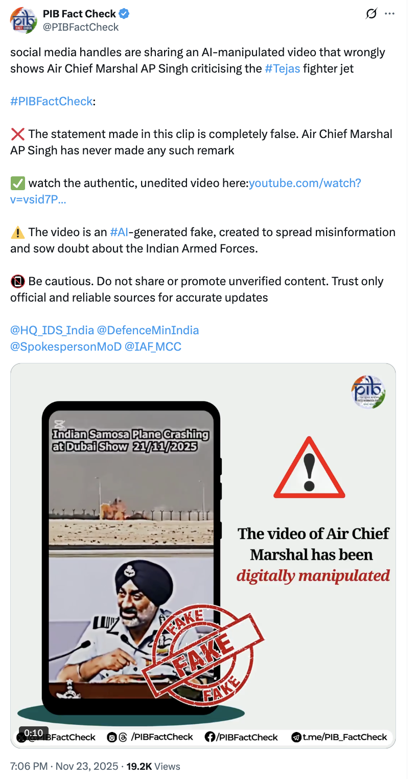 ਵੀਡੀਓ ਵਿੱਚ ਭਾਰਤੀ ਹਵਾਈ ਸੈਨਾ ਦੇ ਮੁਖੀ ਕਹਿੰਦੇ ਹਨ,“ਮੈਂ ਭਾਰਤ ਸਰਕਾਰ ਨੂੰ ਪਹਿਲਾਂ ਹੀ ਕਿਹਾ ਸੀ ਕਿ ਇਸਨੂੰ ਨਾ ਉਡਾਇਆ ਜਾਵੇ ਅਤੇ ਇਸਨੂੰ ਹਵਾਈ ਸੈਨਾ ਵਿੱਚ ਸ਼ਾਮਲ ਨਾ ਕੀਤਾ ਜਾਵੇ ਪਰ ਉਨ੍ਹਾਂ ਨੇ ਸਾਡੀ ਗੱਲ ਨਹੀਂ ਸੁਣੋ ਅਤੇ ਦੇਖੋ ਇਹ ਅੱਜ ਹੋਇਆ। ਇਹ ਜਹਾਜ਼ ਨਹੀਂ ਹੈ। ਇਹ ਸਮੋਸਾ ਹੈ ਅਤੇ ਸਮੋਸੇ ਉੱਡਣ ਲਈ ਨਹੀਂ ਹਨ”