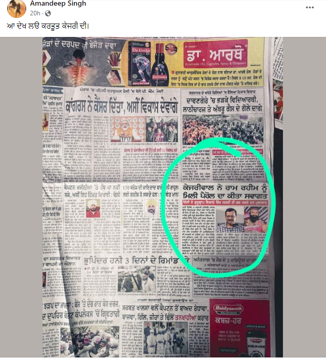 ਸੋਸ਼ਲ ਮੀਡੀਆ ਤੇ ਵਾਇਰਲ ਹੋ ਰਹੀ ਅਖ਼ਬਾਰ ਦੀ ਕਲਿਪਿੰਗ ਦੇ ਮੁਤਾਬਕ ਦਿੱਲੀ ਦੇ ਮੁੱਖ ਮੰਤਰੀ ਕੇਜਰੀਵਾਲ ਨੇ ਡੇਰਾ ਸੱਚਾ ਸੌਦਾ ਗੁਰਮੀਤ ਰਾਮ ਰਹੀਮ ਨੂੰ ਮਿਲੀ ਪੈਰੋਲ ਦਾ ਸਵਾਗਤ ਕੀਤਾ ਜਦਕਿ ਸੋਸ਼ਲ ਮੀਡੀਆ ਤੇ ਵਾਇਰਲ ਹੋ ਰਹੀ ਦੂਜੀ ਪੋਸਟ ਮੁਤਾਬਕ ਪੰਜਾਬ ਦੇ ਸਾਬਕਾ ਸਿੱਖਿਆ ਮੰਤਰੀ ਅਤੇ ਰੋਪੜ ਤੋਂ ਅਕਾਲੀ ਦਲ ਉਮੀਦਵਾਰ ਡਾ ਦਲਜੀਤ ਚੀਮਾ ਨੇ ਡੇਰਾ ਸੱਚਾ ਸੌਦਾ ਮੁਖੀ ਰਾਮ ਰਹੀਮ ਦੀ ਰਿਹਾਈ ਤੇ ਡੇਰਾ ਪ੍ਰੇਮੀਆਂ ਨੂੰ ਵਧਾਈ ਦਿੱਤੀ।