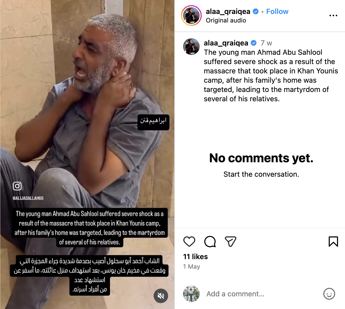 ਆਪਣੀ ਸਰਚ ਦੇ ਦੌਰਾਨ ਸਾਨੂੰ ਇਸ ਵਿਅਕਤੀ ਦੀ ਦੂਜੇ ਐਂਗਲ ਤੋਂ ਲਈ ਗਈ ਵੀਡੀਓ ਪੱਤਰਕਾਰ alaa_qraiqea ਦੇ ਇੰਸਟਾਗ੍ਰਾਮ ਅਕਾਊਂਟ ਤੇ ਇੱਕ ਮਈ 2025 ਨੂੰ ਅਪਲੋਡ ਮਿਲੀ। ਵੀਡੀਓ ਨਾਲ ਦਿੱਤੇ ਗਏ ਕੈਪਸ਼ਨ ਦੇ ਮੁਤਾਬਕ,’ਖਾਨ ਯੂਨਿਸ ਕੈਂਪ ਤੇ ਹੋਏ ਹਮਲੇ ਦੇ ਨਤੀਜੇ ਵਜੋਂ ਨੌਜਵਾਨ ਅਹਿਮਦ ਅਬੂ ਸਾਹਲੂਲ ਨੂੰ ਬਹੁਤ ਵੱਡਾ ਸਦਮਾ ਲੱਗਾ ਜਦੋਂ ਉਸ ਦੇ ਪਰਿਵਾਰ ਦੇ ਘਰ ਨੂੰ ਨਿਸ਼ਾਨਾ ਬਣਾਇਆ ਗਿਆ ਸੀ, ਜਿਸ ਕਾਰਨ ਉਸ ਦੇ ਕਈ ਰਿਸ਼ਤੇਦਾਰ ਮਾਰੇ ਗਏ।